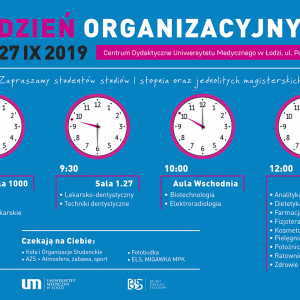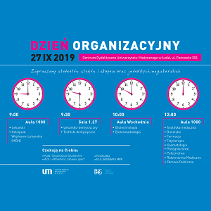 Już w najbliższy piątek (27 września) spotykamy się podczas Dnia Organizacyjnego w Centrum Dydaktycznym Uniwersytetu Medycznego przy ul. Pomorskiej 251. Poza ważnymi informacjami, jak odbiór … Continue reading Zapraszamy studentów studiów I stopnia i jednolitych magisterskich na Dzień Organizacyjny 27 IX 2019