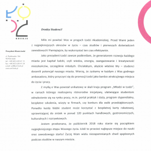 24 września 2018List gratulacyjny od Pani Prezydent dla studentów I roku