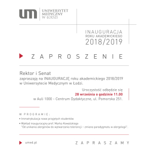 Senat i Rektor Uczelni, mają zaszczyt zaprosić na Inaugurację Roku Akademickiego 2018/2019 w Uniwersytecie Medycznym w Łodzi. Uroczystość odbędzie się 28 września 2018 … Continue reading INAUGURACJA ROKU AKADEMICKIEGO 2018/2019
